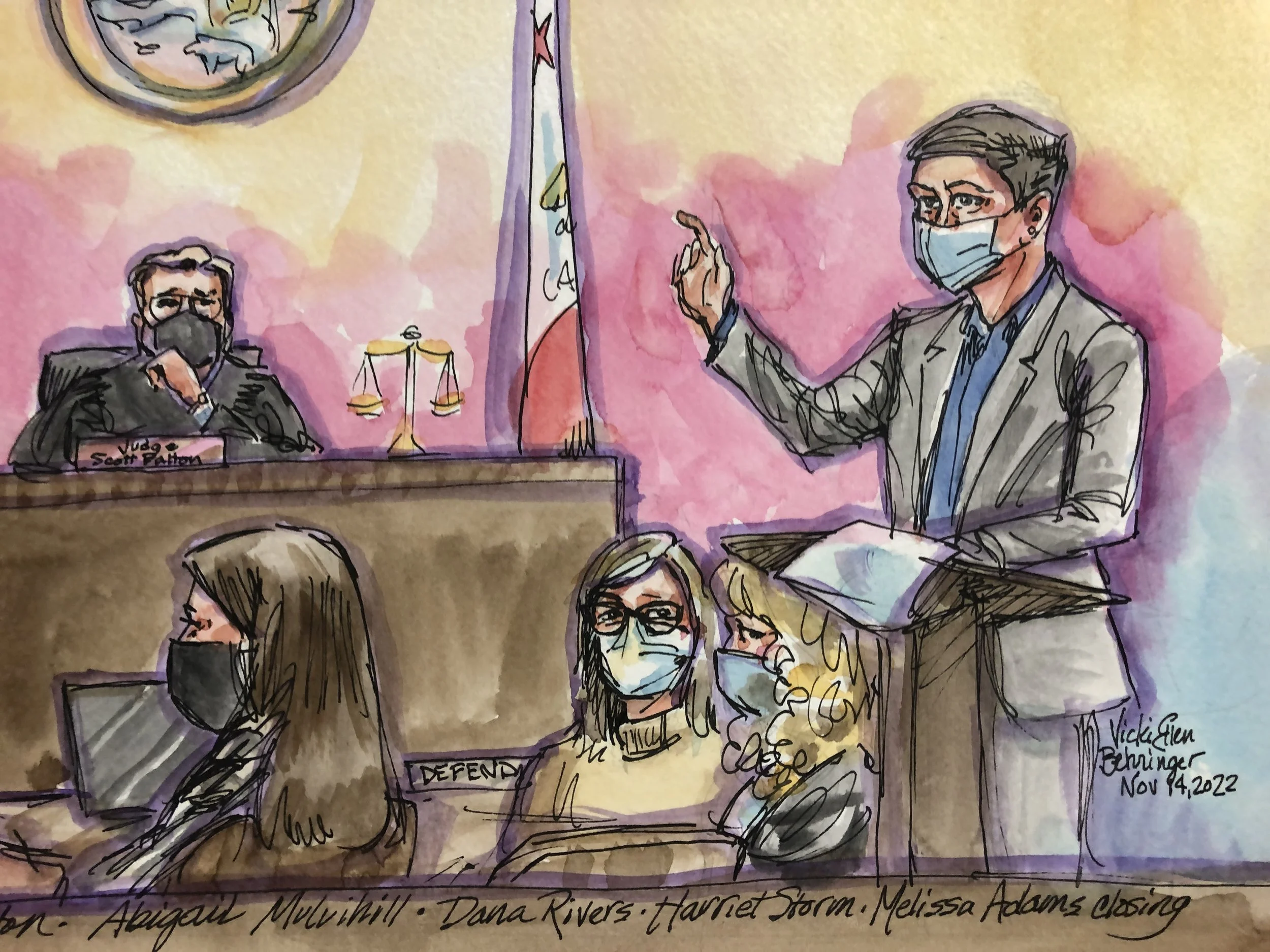 It may not have been noted previously that both attorneys are women: Abigail Mulvihill, Deputy District Attorney, for the Prosecution (P) and Melissa Adams for the Defense (D). They seem to be cordial with each other during breaks and when approaching the bench.