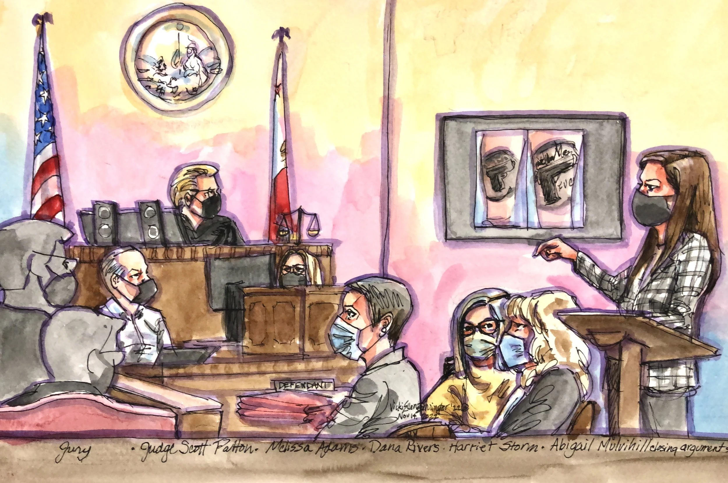 November 15: Closing arguments ended yesterday and the jury began deliberating this morning. It is anyone’s guess how long the jury will take to deliberate. I will have much more to say about the closing arguments soon, but for now, here are some sketches that a local artist made during closing arguments. I am sharing them with permission. Rivers is in the yellow sweater. The first two sketches are of the prosecutor’s closing argument and the second two are of the defense.